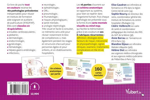 Ce petit livre tout en couleurs recense les 160 pathologies prévalentes indispensables pour réussir en instituts de formation aide-soignant et auxiliaire de puériculture. Elles sont organisées en 16 spécialités : troubles cardiovasculaires, pédiatrie ; dermatologie ; endocrinologie ; gynécologie-obstétrique ; hématologie ; hépato-gastro-entérologie ; infections ; neurologie ; ophtalmologie ; ORL ; pneumologie ; risques physiologiques ; rhumatologie ; santé mentale ; urologie-néphrologie.