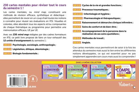 Retrouvez dans un seul livre les 12 unités d'enseigbement du semestre 1 (1re année) en 230 cartes mentales colorées et ludiques : UE 1.1 Psychologie-sociologie-anthropologie ; UE 1.3 Législation-éthique-déontologie ; UE 2.1 Biologie fondamentale ; UE 2.2 Cycles de la vie et grandes fonctions ; UE 2.4 Processus traumatiques ; UE 2.10 Infectiologie-hygiène ; UE 2.11 Pharmacologie et thérapeutiques ; UE 3.1 Raisonnement et démarche clinique infirmière ; UE 4.1 Soins de confort et de bien-être ; UE 5.1 Accompagnement de la personne dans la réalisation de ses soins quotidiens ; UE 6.1 Méthodes de travail ; UE 6.2 Anglais.