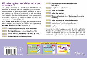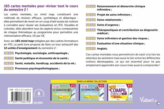 Retrouvez dans un seul livre toutes les unités d'enseignement du semestre 2 (1re année) en 165 cartes mentales colorées et ludiques : UE 1.1 Psychologie-sociologie-anthropologie ; UE 1.2 Santé publique et économie de la santé ; UE 2.3 Santé, maladie, handicap, accidents de la vie ; UE 2.6 Processus psychopathologiques ; UE 3.1 Raisonnement et démarche clinique infirmière ; UE 3.2 Projets de soins infirmiers ; UE 4.2 Soins relationnels ; UE 4.3 Soins d'urgence ; UE 4.4 Thérapeutiques et contribution au diagnostic médical ; UE 4.5 Soins infirmiers et gestion des risques ; UE 5.2 Evaluation d'une situation clinique ; UE 6.2 Anglais.