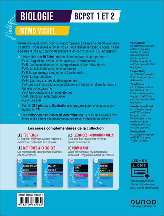 Ce mémo visuel, conçu pour vous accompagner tout au long des deux années de BCPST, vous aidera à réviser vos TP et à faire le lien avec le cours. Il sera également utile aux candidats préparant les concours (CAPES, Agrégation). > L’ensemble des 59 fiches reprend le découpage du programme : SV-A. L’organisme vivant en lien avec son environnement SV-B. Les interactions entre les organismes et leur milieu de vie SV-C. La cellule dans son environnement SV-F. La génomique structurale et fonctionnelle SV-G. La reproduction SV-H. Les mécanismes du développement SV-I. Les communications intercellulaires et l’intégration d’une fonction à l’échelle de l’organisme SV-J. Les populations en écosystèmes SV-K. L’évolution et la phylogénie BG-B. Les sols > Plus de 350 photos et illustrations en couleurs des principaux sujets étudiés en TP. > Des méthodes d’études et de détermination : à la fin de l’ouvrage des fiches outils aident à la présentation des travaux réalisés en séance.