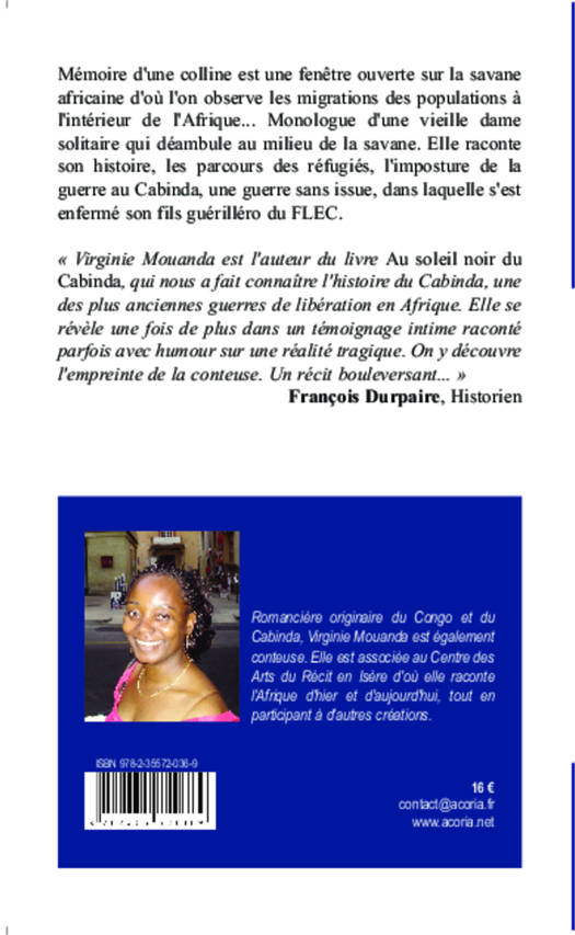 Mémoire d'une colline est une fenêtre ouverte sur la savane africaine d'où l'on observe les migrations des populations à l'intérieur de l'Afrique... Monologue d'une vieille dame solitaire qui déambule au milieu de la savane. Elle raconte son histoire, les parcours des réfugiés, l'imposture de la guerre au Cabinda, une guerre sans issue, dans laquelle s'est enfermé son fils guérillEro du FLEC.