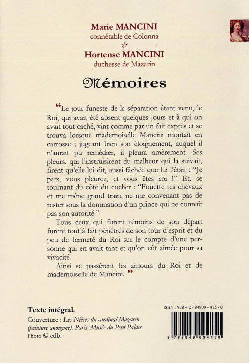 « Le jour funeste de la séparation étant venu, le Roi, qui avait été absent quelques jours et à qui on avait tout caché, vint comme par un fait exprès et se trouva lorsque mademoiselle Mancini montait en carrosse ; jugeant bien son éloignement, auquel il n'aurait pu remédier, il pleura amèrement. Ses pleurs, qui l'instruisirent du malheur qui la suivait, firent qu'elle lui dit, aussi fâchée que lui l'était : "Je pars, vous pleurez, et vous êtes roi !" Et, se tournant du côté du cocher : "Fouette tes chevaux et me mène grand train, ne me convenant pas de rester sous la domination d'un prince qui ne connaît pas son autorité."