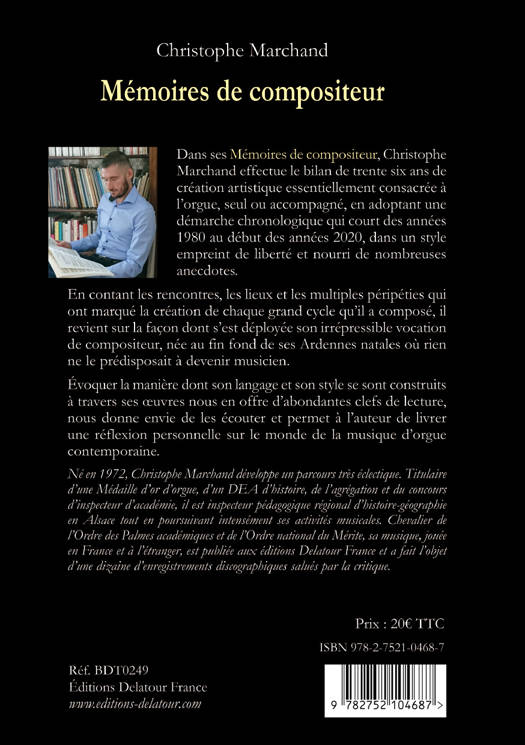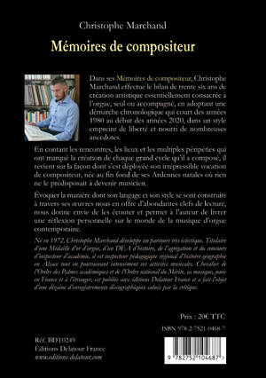 Dans ses Mémoires de compositeur, Christophe Marchand effectue le bilan de trente six ans de création artistique essentiellement consacrée à l’orgue, seul ou accompagné, en adoptant une démarche chronologique qui court des années 1980 au début des années 2020, dans un style empreint de liberté et nourri de nombreuses anecdotes.