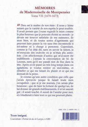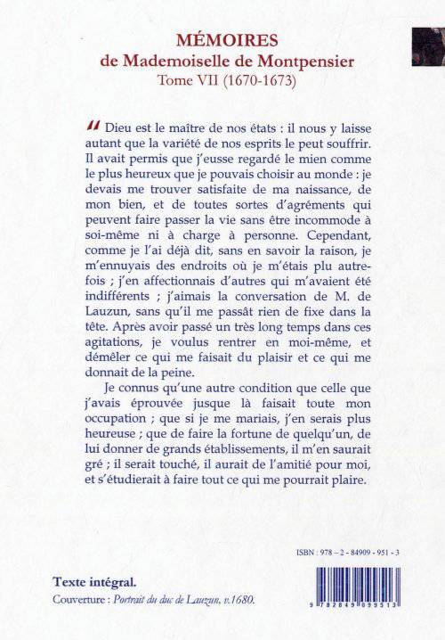 « Dieu est le maître de nos états : il nous y laisse autant que la variété de nos esprits le peut souffrir. Il avait permis que j'eusse regardé le mien comme le plus heureux que je pouvais choisir au monde : je devais me trouver satisfaite de ma naissance, de mon bien, et de toutes sortes d'agréments qui peuvent faire passer la vie sans être incommode à soi-même ni à charge à personne. Cependant, comme je l'ai déjà dit, sans en savoir la raison, je m'ennuyais des endroits où je m'étais plu autrefois ; j'en affectionnais d'autres qui m'avaient été indifférents ; j'aimais la conversation de M. de Lauzun, sans qu'il me passât rien de fixe dans la tête. Après avoir passé un très long temps dans ces agitations, je voulus rentrer en moi-même, et démêler ce qui me faisait du plaisir et ce qui me donnait de la peine.