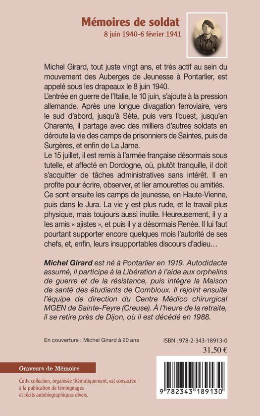 Mémoires de soldat est avant tout le récit d'une errance subie à l'occasion d'événements exceptionnels, la débâcle de juin 1940, la capitulation et les camps de jeunesse. Michel Girard, tout juste vingt ans et très actif au sein du mouvement des Auberges de Jeunesse à Pontarlier, est appelé sous les drapeaux le 8 juin 1940. L'entrée en guerre de l'Italie et l'avancée des troupes allemandes le poussent jusqu'à Sète, puis jusqu'en Charente. Il partage avec des milliers d'autres soldats en déroute la vie des camps de prisonniers de Saintes, puis de Surgères, de La Jarne, avant de gagner les camps de jeunesse en Haute-Vienne et dans le Jura.