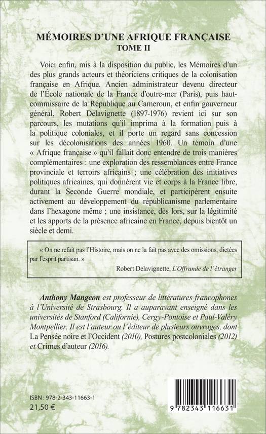 Voici enfin, mis à la disposition du public, les Mémoires d'un des plus grands acteurs et théoriciens critiques de la colonisation française en Afrique. Ancien administrateur devenu directeur de l'Ecole nationale de la France d'outre-mer (Paris), puis haut-commissaire de la République au Cameroun, et enfin gouverneur général, Robert Delavignette (1897-1976) revient ici sur son parcours, les mutations qu'il imprima à la formation puis à la politique coloniales, et il porte un regard sans concession sur les décolonisations des années 1960.