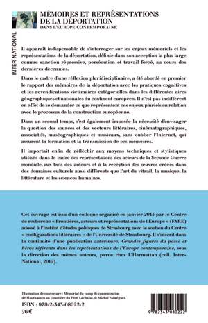Quels sont les enjeux mémoriels et les représentations de la déportation ? Le rapport des mémoires de la déportation avec les pratiques cognitives et les revendications victimaires à travers l'Europe est ici abordé. Puis est envisagée la question des sources et des vecteurs littéraires, cinématographiques, associatifs, muséographiques et musicaux, sans oublier internet. Sont enfin analysés les moyens techniques et stylistiques, les buts des auteurs et la réception d'œuvres de domaines aussi différents que l'art du vitrail, la musique, la littérature, les sciences humaines.