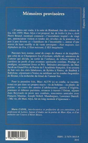 Pour la première fois, Marc Alyn ici se confie, se raconte, remet ses pas dans ses propres traces : vie de bohème - ou plutôt : de poème - au cours des années d'adolescence, guerre d'Algérie, journaux et éditeurs parisiens, errances à travers l'Orient, séjours dans Beyrouth en proie aux combats, rencontres amicales avec François Mauriac, Joseph Delteil, Mandiargues, Lawrence Durrell. «Ma vie, dit Marc Alyn, fut un long moment d'égarement».