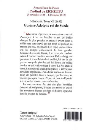« Mais deux régiments de cuirassiers ennemis s'avançant à lui en bataille, le roi de Suède chargea le plus proche, et entra si avant dans la mêlée que son cheval eut un coup de pistolet au travers du cou, et ensuite il en reçut un lui-même qui lui rompit entièrement le bras gauche. Comme il se sentit blessé, il se retira du combat. Alors il vint un cavalier, nommé Falkemberg, qui poussant à toute bride droit au Roi, lui tira de dix pas un coup de pistolet qui lui donna au milieu du dos et qui le fit tomber à terre. Le Roi étant à terre, il ne pouvait quasi plus parler, il arriva trois cavaliers impériaux. L'un d'eux donna au Roi un coup de pistolet dans la tempe, qui l'acheva, et encore quelques coups d'épée, et puis le dépouillèrent, ne lui laissant que sa chemise.