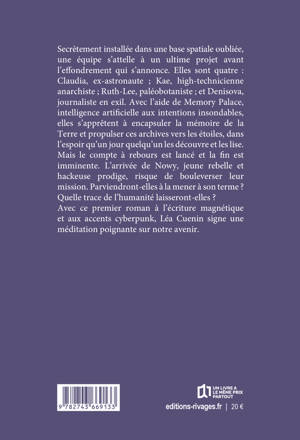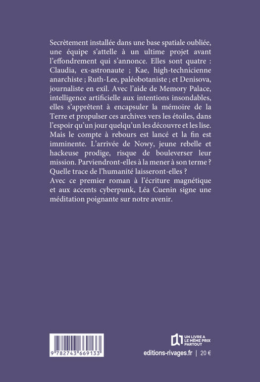 Secrètement installée dans une base spatiale oubliée, une équipe s'attelle à un ultime projet avant l'effondrement qui s'annonce. Elles sont quatre : Claudia, ex-astronaute ; Kae, high-technicienne anarchiste ; Ruth-Lee, paléobotaniste ; et Denisova, journaliste en exil. Avec l'aide de Memory Palace, intelligence artificielle aux intentions insondables, elles s'apprêtent à encapsuler la mémoire de la Terre et propulser ces archives vers les étoiles, dans l'espoir qu'un jour quelqu'un les découvre et les lise. Mais le compte à rebours est lancé et la fin est imminente. L'arrivée de Nowy, jeune rebelle et hackeuse prodige, risque de bouleverser leur mission. Parviendront-elles à la mener à son terme ? Quelle trace de l'humanité laisseront-elles ?