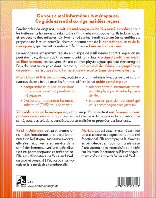 On vous a mal informé sur la ménopause. Ce guide essentiel corrige les idées reçues. Pendant plus de vingt ans, une étude mal conçue de 2002 a semé la confusion sur les traitements hormonaux substitutifs (THS), laissant supposer qu’ils induisent des effets secondaires néfastes. Ce livre, fondé sur les dernières avancées scientifiques, propose une lecture nouvelle, claire et documentée de la périménopause et de la ménopause, qui permettra enfin aux femmes de faire un choix éclairé. La ménopause est souvent réduite à un signe de vieillissement contre lequel on ne peut rien faire, dont on doit seulement subir les effets. Ce signal tardif d’un déséquilibre hormonal est souvent lié à une carence physiologique qui peut être corrigée?! En redonnant au corps ce dont il a besoin, il est possible de réduire les symptômes, de prévenir les risques à long terme et de vivre cette transition avec énergie. Maria Claps et Kristin Johnson, praticiennes en médecine fonctionnelle et cofondatrices d’une clinique pour les femmes, offrent ici un guide complet pour : comprendre ce qui se passe dans votre corps avant et pendant la ménopause?; évaluer si un traitement hormonal substitutif (THS) vous convient?; adapter votre alimentation, votre activité physique et votre hygiène de vie?; trouver un praticien de santé qui vous accompagne avec justesse. Véritable bible de la ménopause, cet ouvrage s’adresse tant aux femmes qu’aux professionnels de santé pour permettre à chacune de reprendre le pouvoir sur sa santé, avec des solutions concrètes, personnalisées et prouvées par la science.