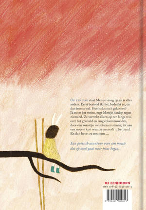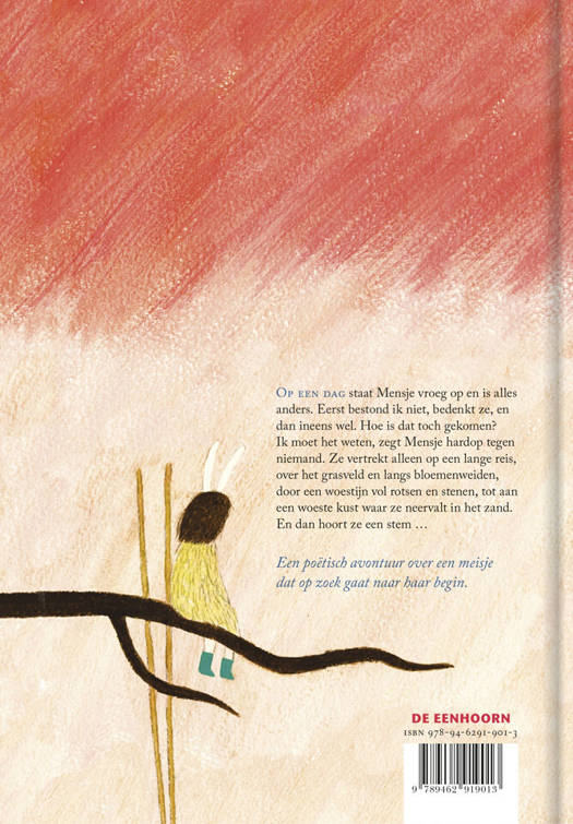 Mensje stelt zich geen vragen bij wat ze deed of gaat doen. Ze vergeet wat ze gedaan heeft en vraagt zich nooit af wat er straks zal gebeuren. Maar op een dag staat ze vroeg op en is alles anders. Eerst bestond ik niet, bedenkt ze, en dan ineens wel. Hoe is dat toch gekomen? ‘Ik moet het weten,’ zegt Mensje hardop tegen niemand. Ze vertrekt alleen op een lange reis, over het grasveld en langs bloemenweiden, door een woestijn vol rotsen en stenen, tot aan een woeste kust waar ze neervalt in het zand. En dan hoort ze een stem …
