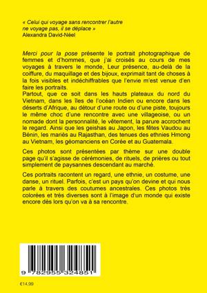 Merci pour la pose présente le portrait photographique de femmes et d'hommes, que j'ai croisés au cours de mes voyages à travers le monde. Leurs présence, au-delà de la coiffure, du maquillage et des bijoux, exprimait tant de choses à la fois visibles et indéchiffrables que l'envie m'est venu d'en faire les portraits. Partout, que ce soit dans les hauts plateaux du nord du Vietnam, dans les iles de l'océan indien ou encore dans les déserts d'Afrique, au détour d'une route ou d'une piste, toujours le même choc d'une rencontre avec une villageoise, ou un nomade dont la personnalité, le vêtement, la parure accrochent le regard. Ces portraits sont présentés par thème sur une double page qu'il s'agisse de cérémonies, de prières ou tout simplement de paysannes descendant au marché. Ils racontent un regard, une ethnies, un costume, une danse, un rituel. Parfois, c'est un pays qu'on devine et qui nous parle à travers des coutumes ancestrales. Ces photos très colorées et très diverses sont à l'image d'un monde qui existe encore dès lors qu'on va à sa rencontre.