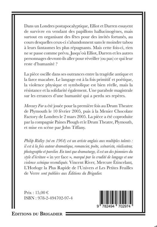 Mercury Fur a été jouée pour la première fois au Drum Theatre de Plymouth le 10 février 2005, puis à la Menier Chocolate Factory de Londres le 2 mars 2005. La pièce a été coproduite par la compagnie Paines Plough et le Drum Theatre, Plymouth, et mise en scène par John Tiffany.
