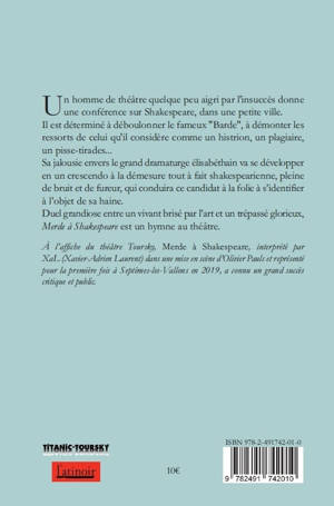 Un homme de théâtre aigri par l'insuccès donne une conférence sur Shakespeare dans une petite ville. Il est déterminé à déboulonner le trop fameux barde, à démonter les ressorts de celui qu'il estime n'être rien d'autre qu'un histrion, un plagiaire, un pisse-tirades sans scrupule... Sa jalousie envers le grand dramaturge élisabéthain va se développer en un crescendo à la démesure tout à fait shakespearienne, pleine de bruit et de fureur, qui conduira ce candidat à la folie à s'identifier à l'objet de sa haine. Merde à Shakespeare est un duel baroque et grandiose entre un vivant brisé par l'art et un trépassé glorieux. C'est aussi un hymne au théâtre. Chacun a le droit d'être Shakespeare !