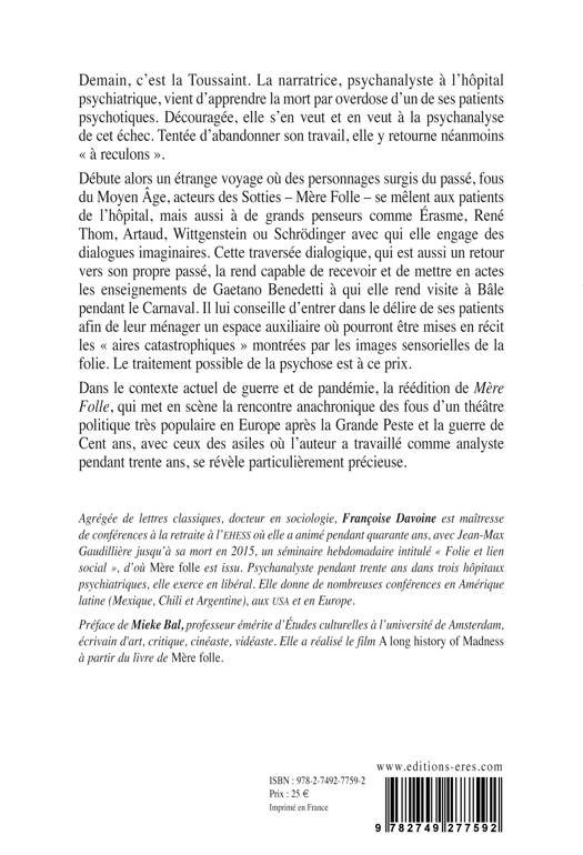 Au Moyen Âge, la folie était traitée aussi comme une maladie cérébrale, avec des coups sur la tête et des drogues de l’oubli, tout en suscitant, dans la littérature, un intérêt passionné par sa capacité à montrer ce qu’il ne faut pas dire… Dans les Sotties-jugement, Mère Folle dont Erasme fit l’Éloge, appelle ses enfants « les Sots et les Sottes » et les lance dans un délire verbal et physique d’une grande virtuosité pour juger tel grand personnage, responsable des abus du temps, qu’ils déshabillent pour montrer aux yeux de tous le costume du fou dissimulé sous ses discours spécieux. Dans le livre, la psychanalyse est jugée par ses patients internés, faisant cause commune avec les Sots médiévaux, qui l’accusent de complicité avec les théories les condamnant pour toujours à la maladie mentale, et d’avoir fait l’impasse sur la grande Histoire et la folie des guerres dans laquelle elle est née.