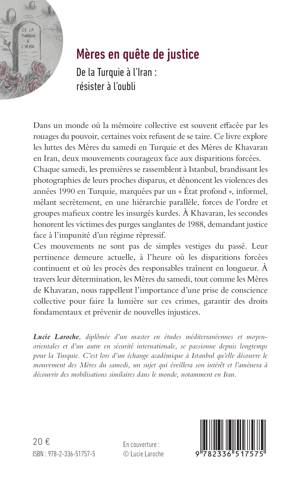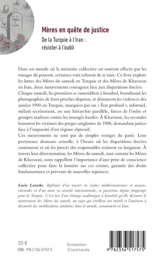 Dans un monde où la mémoire collective est souvent effacée par les rouages du pouvoir, certaines voix refusent de se taire. Ce livre explore les luttes des Mères du samedi en Turquie et des Mères de Khavaran en Iran, deux mouvements courageux face aux disparitions forcées. Chaque samedi, les premières se rassemblent à Istanbul, brandissant les photographies de leurs proches disparus, et dénoncent les violences des années 1990 en Turquie, marquées par un État profond, informel, mêlant secrètement, en une hiérarchie parallèle, forces de l'ordre et groupes mafieux contre les insurgés kurdes. À Khavaran, les secondes honorent les victimes des purges sanglantes de 1988, demandant justice face à l'impunité d'un régime répressif. Ces mouvements ne sont pas de simples vestiges du passé. Leur pertinence demeure actuelle, à l'heure où les disparitions forcées continuent et où les procès des responsables traînent en longueur. À travers leur détermination, les Mères du samedi, tout comme les Mères de Khavaran, nous rappellent l'importance d'une prise de conscience collective pour faire la lumière sur ces crimes, garantir des droits fondamentaux et prévenir de nouvelles injustices.
