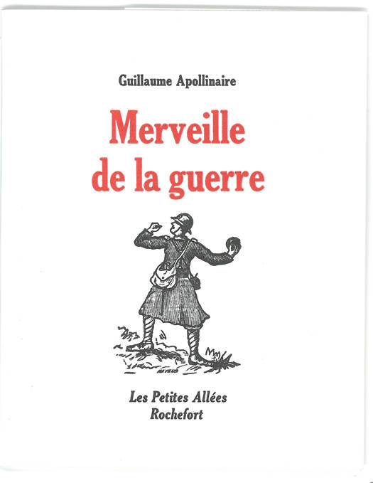Apollinaire a été un poilu comme les autres, mais il a écrit sur la guerre des textes pas comme les autres, dont celui-ci, tiré de Calligrammes. Ce petit livre à poster est imprimé de façon artisanale, à Rochefort, sur un beau papier vergé ; une enveloppe assortie permet de le conserver ou de l’envoyer à qui vous voudrez. Il y a une imprimerie typographique rue Audry de Puyravault, à Rochefort-sur-Mer, depuis au moins cent quatre-vingts ans.. Nous l’avons reprise en 2008, et perpétuons cette technique d’impression, introduite en Occident par Gutenberg au 15e siècle et aujourd’hui presque disparue. Son rendu d’une qualité particulière tient à l’utilisation de caractères mobiles en plomb et de vignettes en cuivre, agencés à la main pour chaque travail, et imprimés en relief sur des presses maintenant d’un âge vénérable, mais toujours vaillantes.
