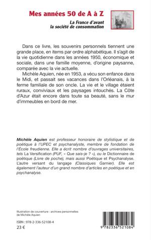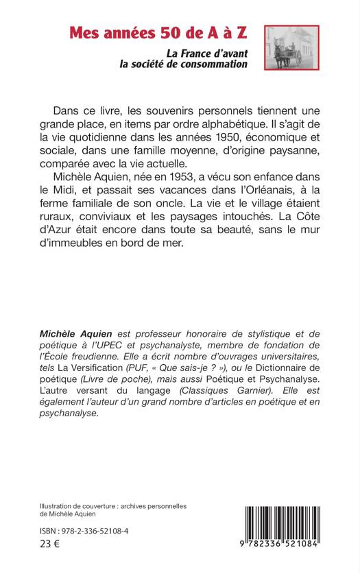 Dans ce livre, les souvenirs personnels tiennent une grande place, en items par ordre alphabétique. Il s'agit de la vie quotidienne dans les années 1950, économique et sociale, dans une famille moyenne, d'origine paysanne, comparée avec la vie actuelle. Michèle Aquien, née en 1953, a vécu son enfance dans le Midi, et passait ses vacances dans l'Orléanais, à la ferme familiale de son oncle. La vie et le village étaient ruraux, conviviaux et les paysages intouchés. La Côte d'Azur était encore dans toute sa beauté, sans le mur d'immeubles en bord de mer.