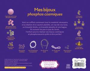 Un coffret avec tout le matériel nécessaire à la création de 5 bijoux : des grosses perles rondes phosphorescente violettes, des breloques étoiles, lune et planète, du élastique et du fil de jade violet. Le tout permettant de faire deux bracelets, une bague, 1 paire de boucles d'oreilles et un sautoir sur le thème cosmique/galaxie. Grâce au livre explicatif de 16 pages avec des pas à pas illustrés, l'enfant va pouvoir réaliser des bijoux phosphorescents et connectés à l'univers prêts à être portés.