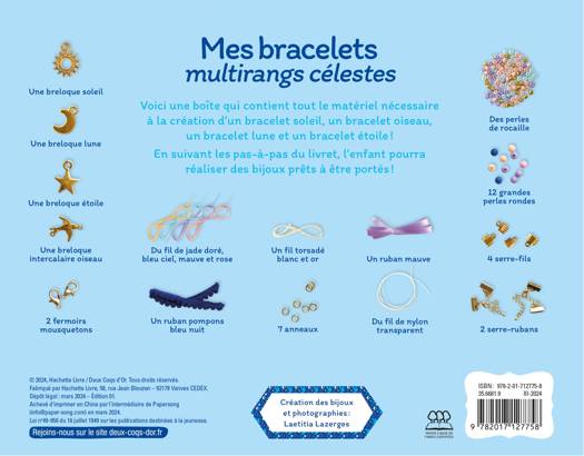 Voici une boîte qui contient tout le matériel nécessaire à la création d'un bracelet soleil, un bracelet oiseau, un bracelet lune et un bracelet étoile ! En suivant les pas-à-pas du livret, l'enfant pourra réaliser des bijoux prêts à être portés !
