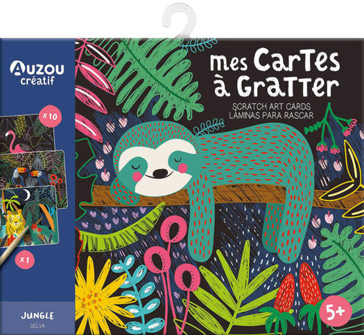 Toucan, paresseux, fleurs tropicales... découvre le monde exotique de la jungle grâce a tes 10 cartes à gratter ! 1 stylet en bois inclus.