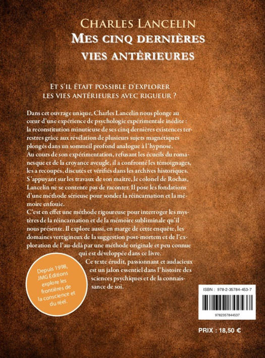 Et s’il était possible d’explorer les vies antérieures avec rigueur ? Dans cet ouvrage unique, Charles Lancelin nous plonge au cœur d’une expérience de psychologie expérimentale inédite : la reconstitution minutieuse de ses cinq dernières existences terrestres grâce aux révélation de plusieurs sujets magnétiques plongés dans un sommeil profond analogue à l’hypnose. Au cours de son expérimentation, refusant les écueils du romanesque et de la croyance aveugle, il a confronté les témoignages, les a recoupés, discutés et vérifiés dans les archives historiques. S’appuyant sur les travaux de son maître, le colonel de Rochas, Lancelin ne se contente pas de raconter. Il pose les fondations d’une méthode sérieuse pour sonder la réincarnation et la mémoire enfouie. C’est en effet une méthode rigoureuse pour interroger les mystères de la réincarnation et de la mémoire subliminale qu’il nous présente. Il explore aussi, en marge de cette enquête, les domaines vertigineux de la suggestion post-mortem et de l’exploration de l’au-delà par une méthode originale et peu connue qui est développée dans ce livre. Ce texte érudit, passionnant et audacieux est un jalon essentiel dans l’histoire des sciences psychiques et de la connaissance de soi.