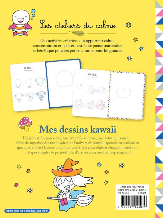 Un panda, une licorne, un sushi ou encore un cupcake... Voici 30 dessins kawaï trop mignons à reproduire facilement en suivant les pas à pas ! Sur la page de gauche, les modèles sont décomposés en 5 étapes, tandis que sur la page de droite, un espace est destiné à la reproduction. Une activité qui permet de réaliser facilement des illustrations inratables !