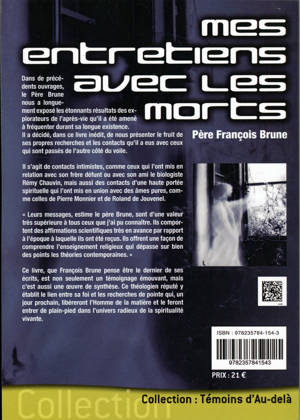 Dans de précédents ouvrages, le Père Brune nous a longuement exposé les étonnants résultats des explorateurs de l'après-vie qu'il a été amené à fréquenter durant sa longue existence. Il a décidé, dans ce livre inédit, de nous présenter le fruit de ses propres recherches et les contacts qu'il a eus avec ceux qui sont passés de l'autre côté du voile. Il s'agit de contacts intimistes, comme ceux qui l'ont mis en relation avec son frère défunt ou avec son ami le biologiste Rémy Chauvin, mais aussi des contacts d'une haute portée spirituelle qui l'ont mis en union avec des âmes pures, comme celles de Pierre Monnier et de Roland de Jouvenel. «Leurs messages, estime le père Brune, sont d'une valeur très supérieure à tous ceux que j'ai pu connaître. Ils comportent des affirmations scientifiques très en avance par rapport à l'époque à laquelle ils ont été reçus. Ils offrent une façon de comprendre l'enseignement religieux qui dépasse sur bien des points les théories contemporaines.» Ce livre, que François Brune pense être le dernier de ses écrits, est non seulement un témoignage émouvant, mais c'est aussi une œuvre de synthèse. Ce théologien réputé y établit le lien entre sa foi et les recherches de pointe qui, un jour prochain, libèreront l'Homme de la matière et le feront entrer de plain-pied dans l'univers radieux de la spiritualité vivante.