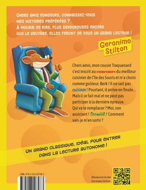 Chers amis, mon cousin Traquenard s'est inscrit au concours du meilleur cuisinier de l'île des Souris et m'a choisi comme goûteur. Berk ! Il ne sait pas cuisiner ! Pourtant, il arrive en finale... Mais il se fait mal et ne peut pas participer à la dernière épreuve. Qui va le remplacer ? Moi, son assistant ! Scouiiit ! Comment vais-je m'en sortir ?