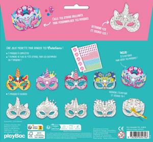 5 masques à décorer ou à colorier, une superbe planche de strass pour les personnaliser et une jolie pochette pour ranger tes créations.