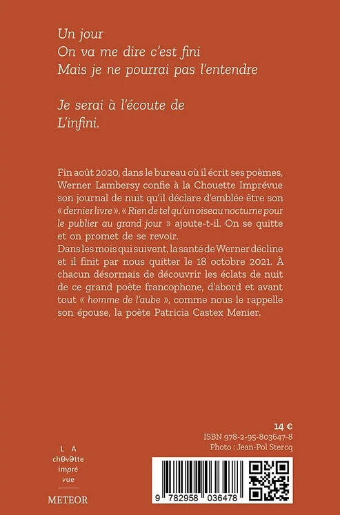 Fin août 2020, dans le bureau où il écrit ses poèmes, Werner Lambersy confie à la Chouette Imprévue son journal de nuit qu'il déclare d'emblée être son "dernier livre". "Rien de tel qu'un oiseau nocturne pour le publier au grand jour" ajoute-t-il. On se quitte et on se promet de se revoir.