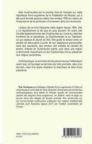 Mes Oudmourties est le premier livre en français sur cette république finno-ougrienne de la Fédération de Russie, qui a été zone fermée jusqu'au début des années 1990 en raison de l'importance de la production d'armement dans son économie. L'auteur de ce livre fréquente cette région depuis 1994. En outre, elle travaille également avec des Oudmourtes qui vivent au-delà des frontières de la république, au Bachkortostan et au Tatarstan, ce qui explique le pluriel du titre. Elle guide le lecteur dans un périple de découverte à partir de son expérience personnelle, avec des souvenirs, des articles, des extraits de carnets de terrain, d'abord en Oudmourtie même, puis dans une région à dominante musulmane où les Oudmourtes ont pu préserver leur religion autochtone.