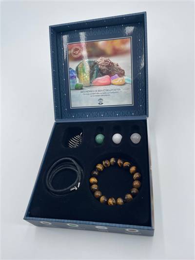 pour vous initier à la lithothérapie à travers un livre d'explication et de conseils, 3 pierres polies rondes : quartz rose, jade blanc et aventurine, 1 bracelet en pierre œil du tigre et des accessoires : 1 cordon tour de cou et un pendentif cage spirale pour contenir la pierre polie de votre choix.