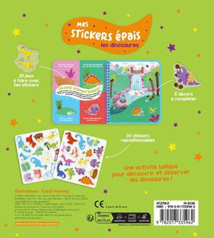 Une activité ludique pour découvrir et observer les dinosaures : 5 grands décors et 25 petits jeux à compléter avec 30 stickers en silicone, épais et repositionnables.