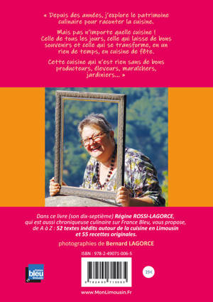 Dans ce livre (son 17ème), Régine ROSSI-LAGORCE, qui est aussi chroniqueuse culinaire sur France Bleu depuis plusieurs années, propose, de A à Z : 52 textes inédits autour de la cuisine en Limousin et 55 recettes originales. Un livre richement illustré, tout en couleur, qui fait voyager le lecteur dans tout le Limousin, mais aussi dans des pays lointains, grâce aux épices notamment... « Depuis des années, j’explore le patrimoine culinaire pour raconter la cuisine. Mais pas n’importe quelle cuisine ! Celle de tous les jours, celle qui laisse de bons souvenirs et celle qui se transforme, en un rien de temps, en cuisine de fête. Cette cuisine qui n’est rien sans de bons producteurs, éleveurs, maraîchers, jardiniers... »