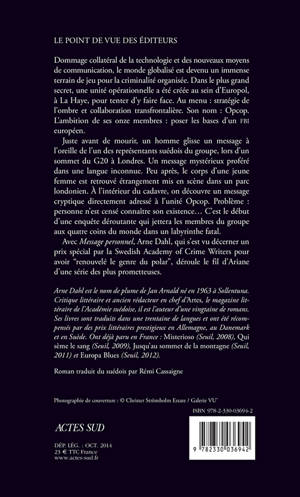 Juste avant de mourir, un homme glisse un message à l'oreille de l'un des représentants suédois du groupe, lors d'un sommet du G20 à Londres. Un message mystérieux proféré dans une langue inconnue. Peu après, le corps d'une jeune femme est retrouvé étrangement mis en scène dans un parc londonien. À l'intérieur du cadavre, on découvre un message cryptique directement adressé à l'unité Opcop. Problème : personne n'est censé connaître son existence... C'est le début d'une enquête déroutante qui jettera les membres du groupe aux quatre coins du monde dans un labyrinthe fatal. Avec Message personnel, Arne Dahl, qui s'est vu décerner un prix spécial par la Swedish Academy of Crime Writers pour avoir "renouvelé le genre du polar", déroule le fil d'Ariane d'une série des plus prometteuses.