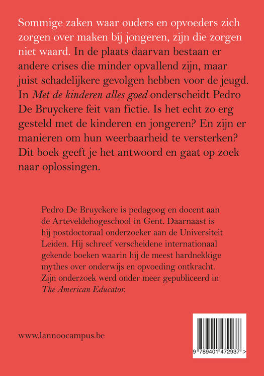 In de plaats daarvan bestaan er andere crises die minder opvallend zijn, maar juist schadelijkere gevolgen hebben voor de jeugd. In Met de kinderen alles goed onderscheidt Pedro De Bruyckere feit van fictie. Is het echt zo erg gesteld met de kinderen en jongeren? En zijn er manieren om hun weerbaarheid te versterken?