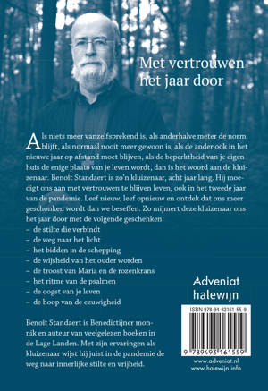 Als niets meer vanzelfsprekend is, als anderhalve meter de norm blijft, als normaal nooit meer gewoon is, als de ander ook in het nieuwe jaar op afstand moet blijven, als de beperktheid van je eigen huis de enige plaats van je leven wordt, dan is het woord aan de kluizenaar. Benoît Standaert is zo’n kluizenaar, acht jaar lang. Hij moedigt ons aan met vertrouwen te blijven leven, ook in het tweede jaar van de pandemie. Leef nieuw, leef opnieuw en ontdek dat ons meer geschonken wordt dan we beseffen. Zo mijmert deze kluizenaar ons het jaar door met de volgende geschenken: – de stilte die verbindt – de weg naar het licht – het bidden in de schepping – de wijsheid van het ouder worden – de troost van Maria en de rozenkrans – het ritme van de psalmen – de oogst van je leven – de hoop van de eeuwigheid Benoît Standaert is Benedictijner monnik en auteur van veelgelezen boeken in de Lage Landen. Met zijn ervaringen als kluizenaar wijst hij juist in de pandemie de weg naar innerlijke stilte en vrijheid.