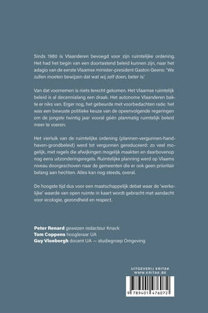 Sinds 1980 is Vlaanderen bevoegd voor zijn ruimtelijke ordening. Het had het begin van een doortastend beleid kunnen zijn, naar het adagio van de eerste Vlaamse minister-president Gaston Geens: 'We zullen moeten bewijzen dat wat wij zelf doen, beter is.' Van dat voornemen is niets terecht gekomen. Het Vlaamse ruimtelijk beleid is al decennialang een draak. Het autonome Vlaanderen bakte er niks van. Erger nog, het gebeurde met voorbedachten rade: het was een bewuste politieke keuze van de opeenvolgende regeringen om de jongste twintig jaar vooral géén planmatig ruimtelijk beleid meer te voeren. Het vierluik van de ruimtelijke ordening (plannen-vergunnen-handhaven-grondbeleid) werd tot vergunnen gereduceerd: zo veel mogelijk, met regels die afwijkingen mogelijk maakten en daarbovenop nog eens uitzonderingsregels. Ruimtelijke planning werd op Vlaams niveau doorgeschoven naar de gemeenten die er ook geen prioritair belang aan hechten. Alles kan nog steeds, overal. De hoogste tijd dus voor een maatschappelijk debat waar de 'werkelijke' waarde van open ruimte in kaart wordt gebracht met aandacht voor ecologie, gezondheid en respect.