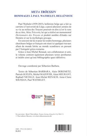 Paul Wathelet (1939-2015), helléniste belge ayant fait sa carrière à l'université de Liège, a passé plusieurs années de sa vie au milieu des Troyens pourrait-on dire (c'est le sens de ce titre, Meta Trôessin), lui qui a réalisé un monumental Dictionnaire des Troyens et produit nombre d'études sur Homère et sur la mythologie grecque. Pour lui rendre hommage, plusieurs chercheurs belges et français ont réuni ici quelques travaux allant du monde hittite au monde scandinave, en passant par l'Antiquité gréco-romaine.