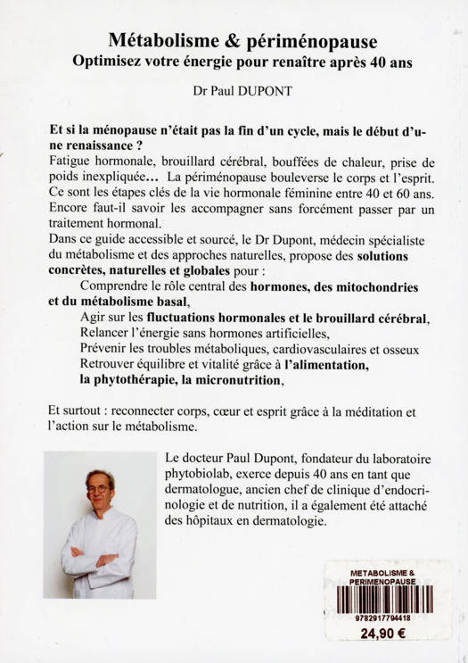 Ce livre aborde les stratégies naturelles pour passer le cap de la periménopause en agissant sur le métabolisme. Il se divise en 4 grandes parties. Partie 1 : Réveiller son métabolisme en périménopause : l’énergie au cœur du changement. Comprendre comment la chute hormonale perturbe notre moteur interne et comment soutenir naturellement le métabolisme féminin. Le métabolisme ralentit souvent dès la quarantaine. Cette partie dévoile les liens entre énergie vitale, mitochondries et métabolisme basal, et montre comment préserver son énergie vitale pour éviter fatigue, prise de poids et perte d’élan vital. Partie 2 : La préménopause : reprendre le contrôle face aux montagnes russes hormonales. Fatigue, moral en dents de scie, irritabilité, baisse de libido ? Découvrez comment stabiliser naturellement les fluctuations hormonales avant la ménopause. Cette phase de transition est marquée par des hauts et des bas. Grâce à la phytothérapie, à la nutrition ciblée et au soutien de l’oestrobolome intestinal, vous pouvez traverser cette étape avec plus de sérénité et de vitalité. Partie 3 : Ménopause : relancer l’énergie sans hormones, sans bouffées, sans brouillard. Cerveau embrumé, troubles du sommeil, chaleur soudaine… pas une fatalité. Voici comment raviver votre énergie avec des méthodes naturelles. À la ménopause, l’énergie doit être recentrée. Cette partie explore le rôle de l’iode, des plantes adaptogènes, du sommeil réparateur et des outils pour retrouver clarté mentale et énergie sans effets secondaires. Partie 4 : Post-ménopause : protéger son corps et son cœur après 50 ans. Prévenir les risques cardiovasculaires, l’ostéoporose, la fonte musculaire et les troubles métaboliques grâce à une approche globale. C’est le moment de poser les fondations d’un vieillissement en pleine forme. En agissant sur l’alimentation, l’activité physique, la supplémentation ciblée et l’éveil psycho-émotionnel, il est possible de préserver sa santé sur le long terme.