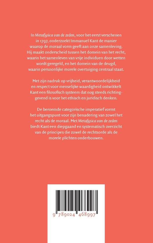 In Metafysica van de zeden, voor het eerst verschenen in 1797, onderzoekt Immanuel Kant de manier waarop de moraal vorm geeft aan onze samenleving. Hij maakt onderscheid tussen het domein van het recht, waarin het samenleven van vrije individuen door wetten wordt geregeld, en het domein van de deugd, waarin persoonlijke morele overtuiging centraal staat. Met zijn nadruk op vrijheid, verantwoordelijkheid en respect voor menselijke waardigheid ontwikkelt Kant een filosofisch systeem dat nog steeds richtinggevend is voor het ethisch en juridisch denken. De beroemde categorische imperatief vormt het uitgangspunt voor zijn benadering van zowel het recht als de moraal. Met Metafysica van de zeden biedt Kant een diepgaand en systematisch overzicht van de principes die zowel de rechtsorde als de morele plichten onderbouwen.