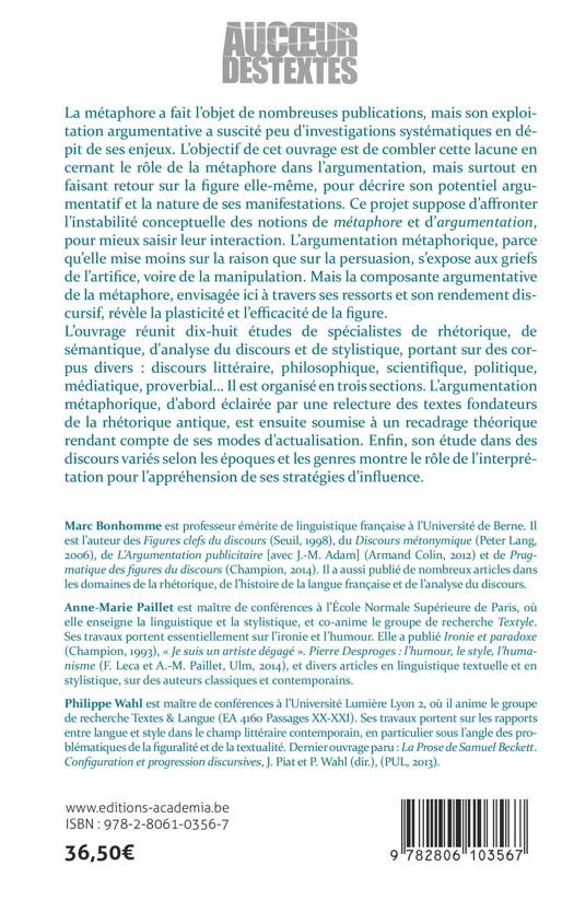 La métaphore a fait l'objet de nombreuses publications, mais son exploitation argumentative a suscité peu d'investigations systématiques en dépit de ses enjeux. L'objectif de cet ouvrage est de combler cette lacune en cernant le rôle de la métaphore dans l'argumentation, mais surtout en faisant retour sur la figure elle-même, pour décrire son potentiel argumentatif et la nature de ses manifestations.