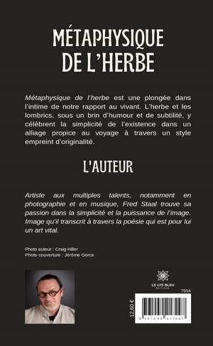 Métaphysique de l'herbe est une plongée dans l'intime de notre rapport au vivant. L'herbe et les lombrics, sous un brin d'humour et de subtilité, y célèbrent la simplicité de l'existence dans un alliage propice au voyage à travers un style empreint d'originalité.