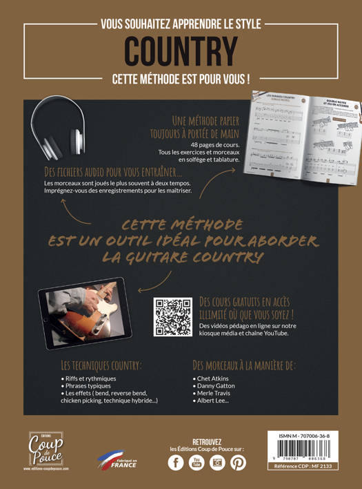 Chet Atkins, Danny Gatton, Merle Travis, Albert Lee… Vous appréciez la musique country ? Alors adoptez cette méthode. Maîtrisez les Riffs, rythmiques, phrases country incontournables, effets : bend, reverse bend, chicken picking, …