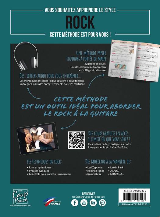 Maîtrisez les techniques de la guitare Rock Le hammer, pulling, bend et reverse bend, vibrato, chord mute, palm mute Les riffs et rythmiques Les phrases typiques employées en rock Un chapitre consacré à la technique des effets utilisés dans ce style vous permettra de jouer plusieurs interprétations de vos morceaux.