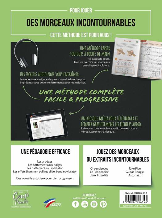 Vous prendrez plaisir à découvrir tous les effets de jeux possible à la guitare: le hammer, le pulling, le slide, le bend et le vibrato. Les principales notions de solfèges sont expliquées au début de la méthode coup de pouce guitare volume 2.