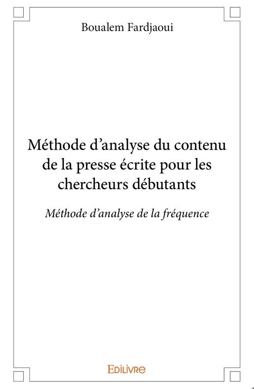 La méthode d'analyse de contenu dite d'« inférence » est présentée, dans cet ouvrage, de manière simple et synthétique. Le jeune chercheur peut l'utiliser dans l'analyse de corpus, notamment ceux de la presse. Ce livre a une approche pratique et pragmatique, loin des considérations exclusivement théoriques. Son but est de décrire objectivement le corpus en suivant une approche quantitative et qualitative recherchant le contenu manifeste et latent. Boualem Fardjaoui présente notamment d'autres méthodes d'analyse de contenu en guise de comparaison. Il fait aussi un survol des concepts importants mobilisés, comme le sens donné aux notions de contenu, d'inférence ou encore d'unité d'information... L'auteur finit son propos par la distinction entre les méthodes d'analyses de contenu et de discours qui sont souvent confondues.