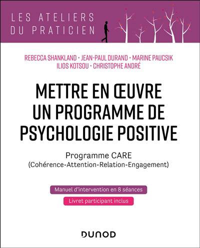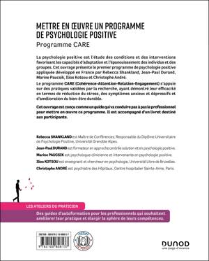 L’ouvrage présente le programme de psychologie positive appliquée CARE (Cohérence - Attention - Relation - Engagement). Ce programme innovant dans le domaine de psychologie propose aux participants pendant 8 séances de 2h diverses pratiques favorisant 1) la réorientation de l’attention vers les aspects constructifs du quotidien, 2) le développement de la bienveillance envers soi, autrui et l’environnement, 3) l’identification des valeurs et l’engagement dans des actions en lien avec celles-ci, augmentant par-là la satisfaction et le sens de la vie. Ces pratiques ont été validées par des recherches en psychologie positive et ont montré leur efficacité en termes d’amélioration du bien-être et de réduction du stress, des symptômes anxieux et dépressifs.